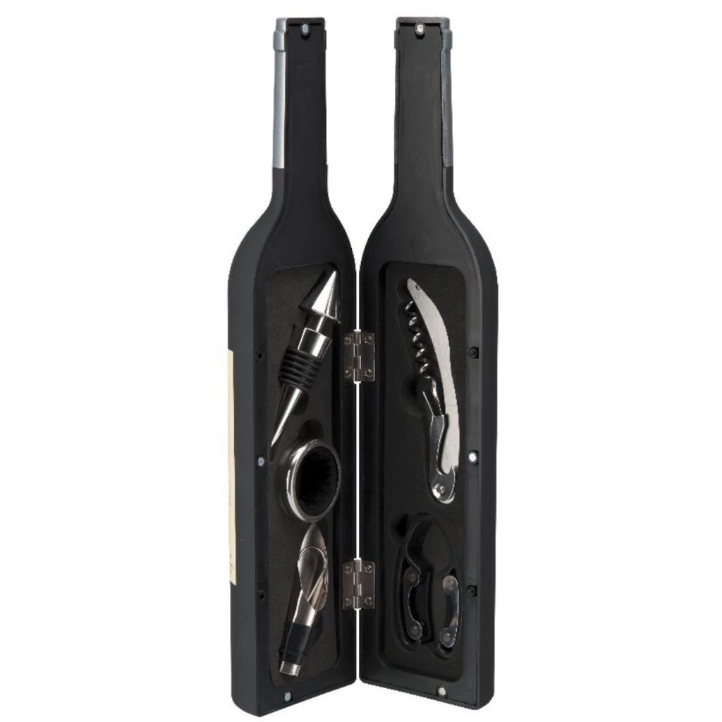 Ett läckert vinset med 5 st vintillbehör. Lådan är dekorativt utformad som en vinflaska och passar perfekt till vinprovningen eller festen. De fem tillbehören är; 1 st vinöppnare, 1 st vinstopper, 1 st hällpip, 1 st vintermometer och en droppring.