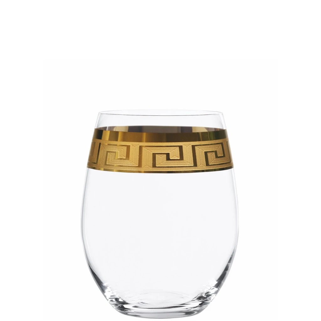 Denna läckra tumbler har ett band med grekiska nycklar i guld upptill. Muse Tumbler är ett perfekt matchande vattenglas till den övriga serien men står även själv ut som ett exklusivt vinglas utan stjälk till både röda och vita viner. Guldbandet upptill bidrar med en flärdfull nyans utan att ta för mycket plats som helhet.