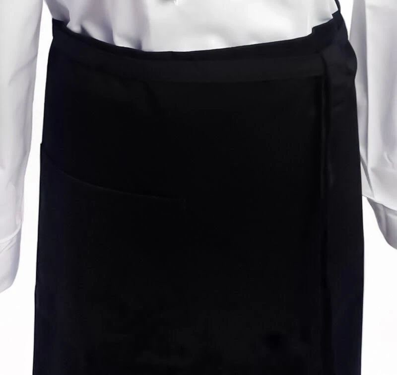 Elegant svart serveringsförkläde som sträcker sig från midjehöjd till fötterna för servering och tillreding. Detta stilrena förkläde håller restaurangstandard och har en diskret men lyxig proper utformning. Perfekt att kombinera med en kockrock eller liknande serveringsklädsel. Förklädet är försett med en praktisk ficka och lämpar sig utmärkt vid såväl servering som vid en vinprovning eller dylikt. Ett praktiskt och slittåligt förkläde med snygg design.